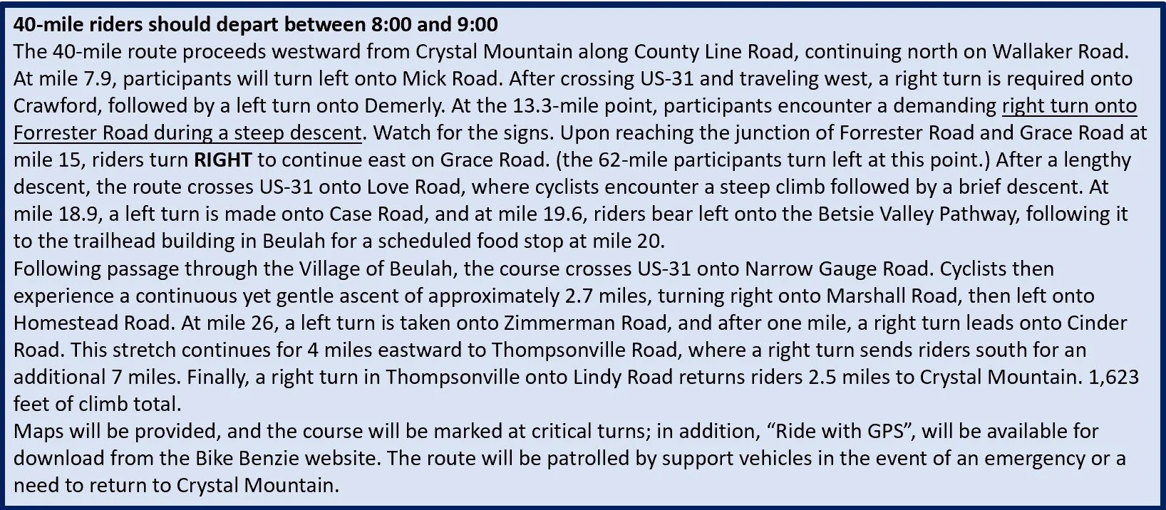 The Bike Benzie Tour presents three cycling tour routes. Two in Benzie County and one in Manistee County. The fun begins at The Crystal Mountain in Thompsonville. The routes have been selected based on the experiences of local cyclists. For the most part we have selected roads with shoulders and minimal traffic for the time of year. We are committed to provide a safe and rewarding experience with SAG support, food stops, and scenic vistas.